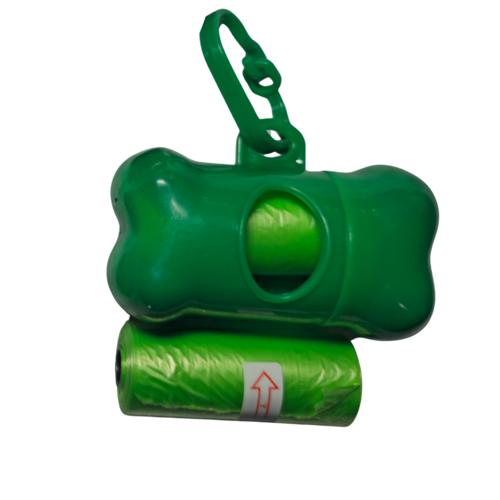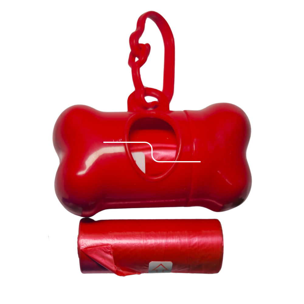 Cada set incluye un estuche con forma de hueso fabricado en plástico duro, liviano y resistente, que protege y mantiene las bolsas organizadas. Su diseño con dispensador lateral permite sacar una bolsa a la vez sin desperdiciar, evitando el típico enredo o rasgado.