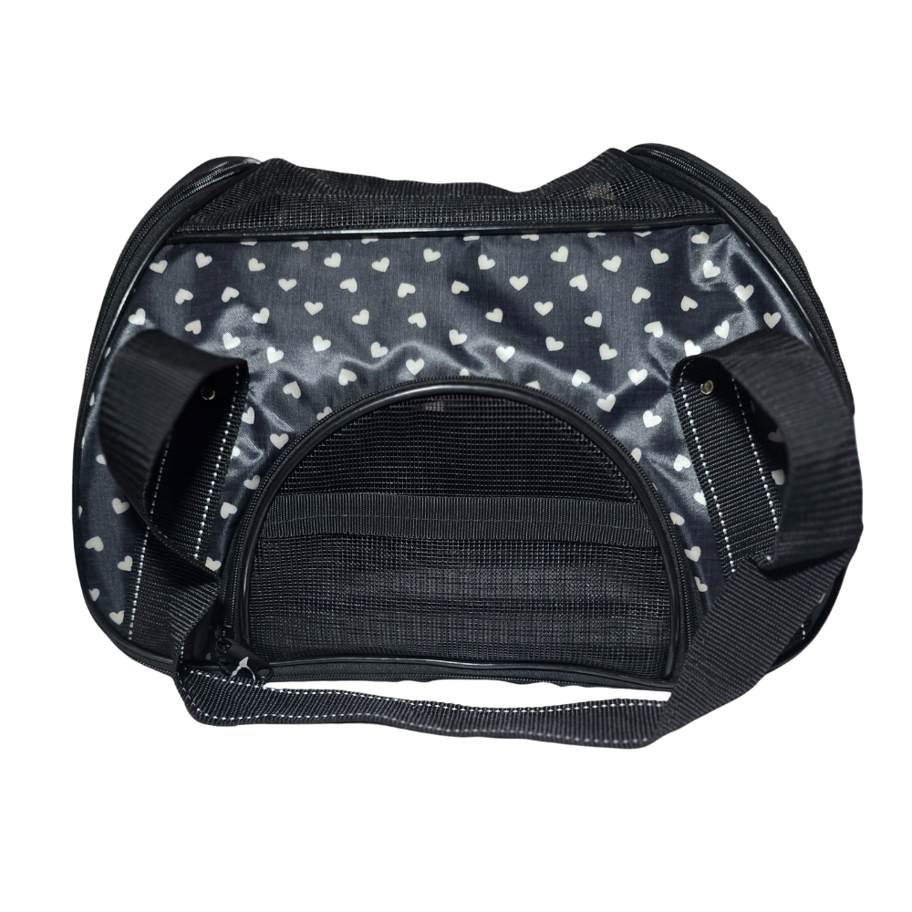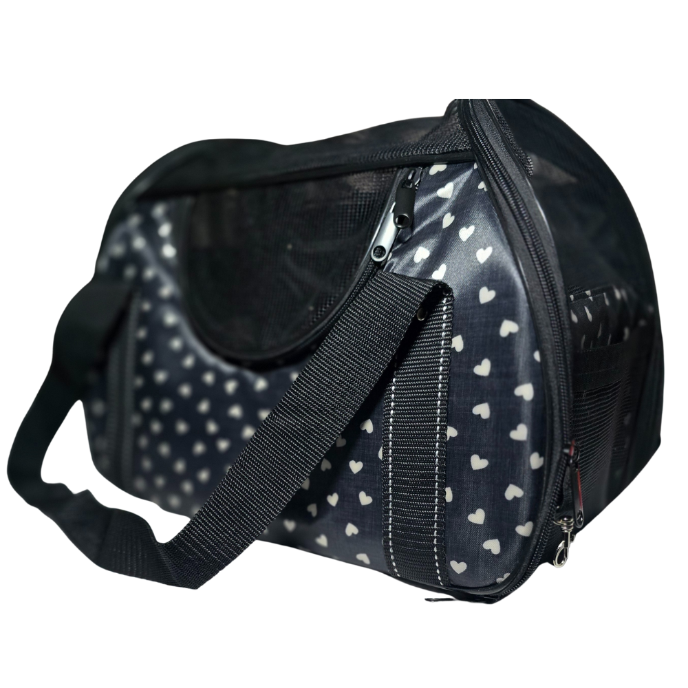 El Bolso Plegable para Mascotas Negro / Corazones cuenta con paneles de malla respirable que permiten una óptima circulación de aire, evitando el calor y el estrés durante el transporte.