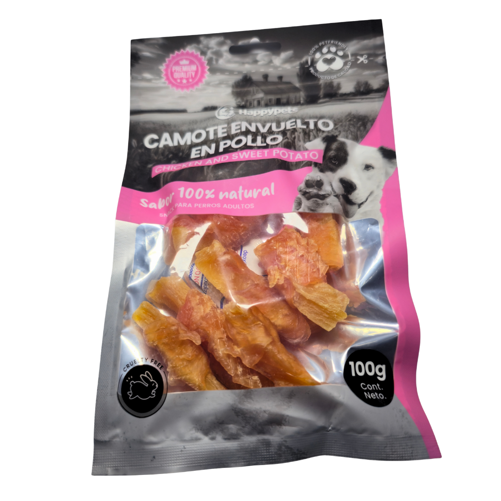 El camote, rico en fibra, betacarotenos, vitaminas A y C, contribuye a una digestión saludable, mejora la inmunidad y favorece el brillo del pelaje. Envueltos en finas tiras de pollo deshidratado, estos snacks aportan proteínas de alta calidad que ayudan a fortalecer los músculos y mantener una condición física óptima.