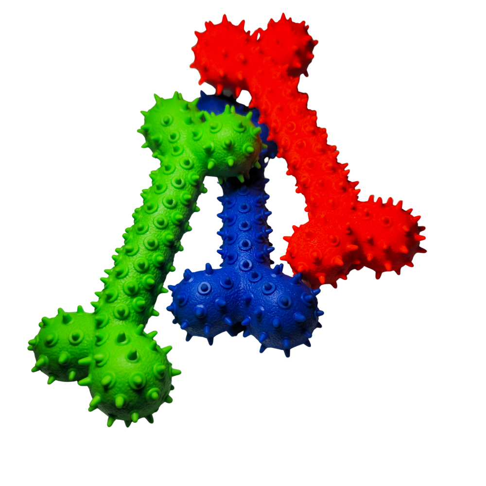 Fabricado con goma elastomérica no tóxica, este juguete es lo suficientemente firme para resistir mordidas intensas, pero también lo bastante suave para no dañar los dientes ni las encías. Su diseño con relieves, nódulos y ranuras actúa como un limpiador dental natural: masajea, estimula y ayuda a reducir la acumulación de placa mientras tu perro se divierte.