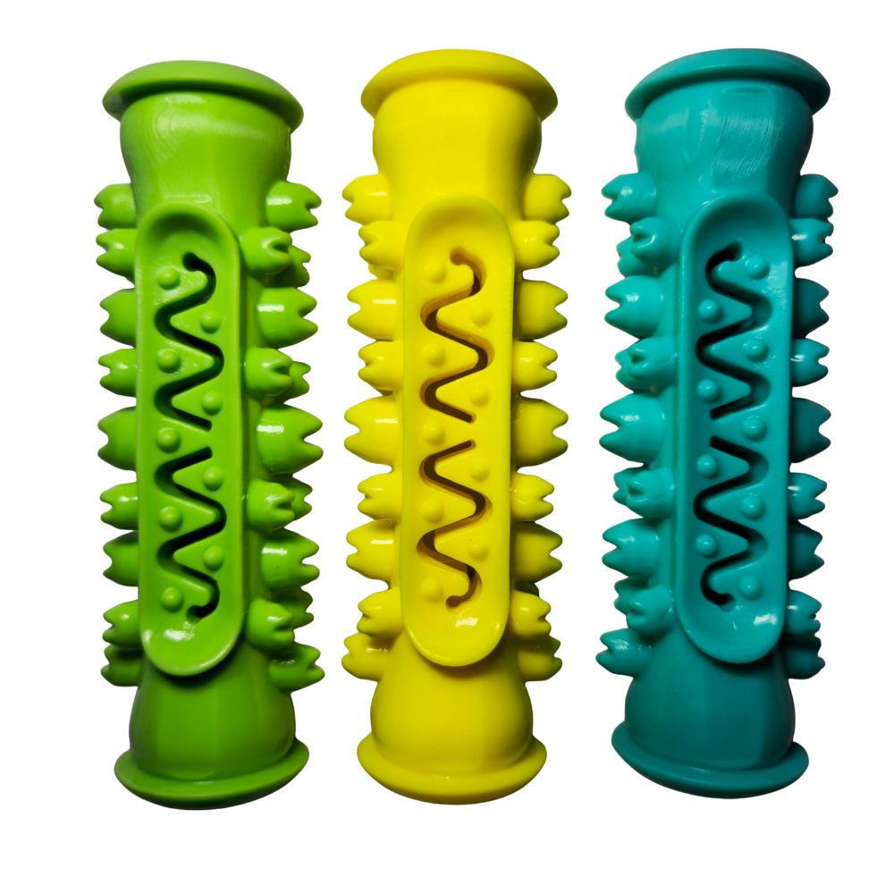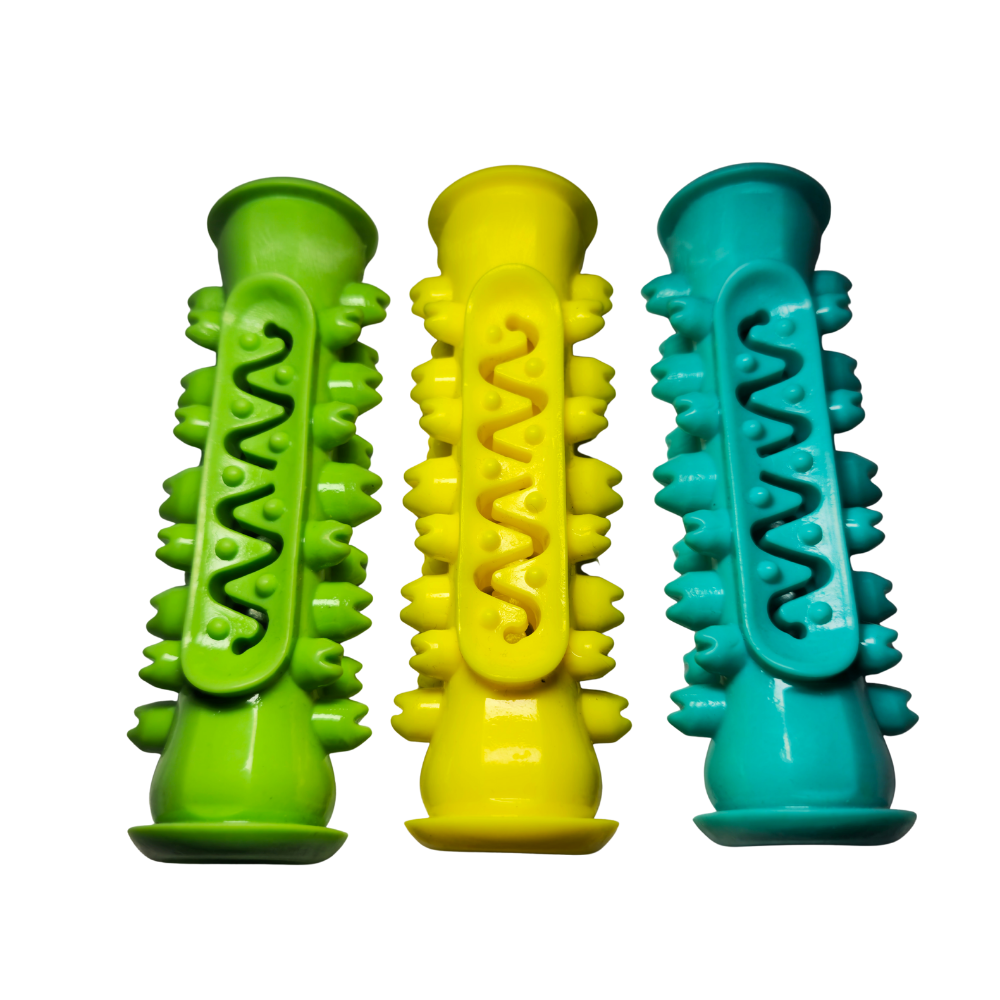 Su material es resistente pero flexible, lo que proporciona una mordida segura sin dañar los dientes. Es fácil de limpiar, reutilizable y apto para uso diario. Puedes rellenarlo con pellets, snacks blandos o pasta dental comestible para perros, convirtiendo cada sesión en una experiencia nueva y deliciosa.