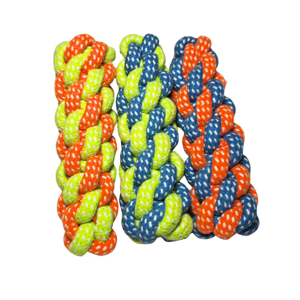 Cada hebra del tejido contribuye a eliminar restos de comida y placa de forma natural, actuando como un “cepillo” mientras el perro juega. Perfecto para juegos de tironeo, buscar o lanzar, este juguete fomenta la actividad física, la conexión con el tutor y la liberación de energía acumulada.