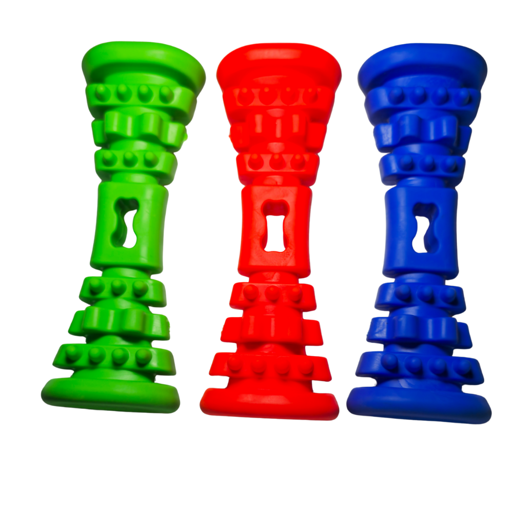 Fabricado con goma resistente y no tóxica, este cilindro está pensado para soportar mordidas intensas sin deformarse, manteniendo su forma y función.