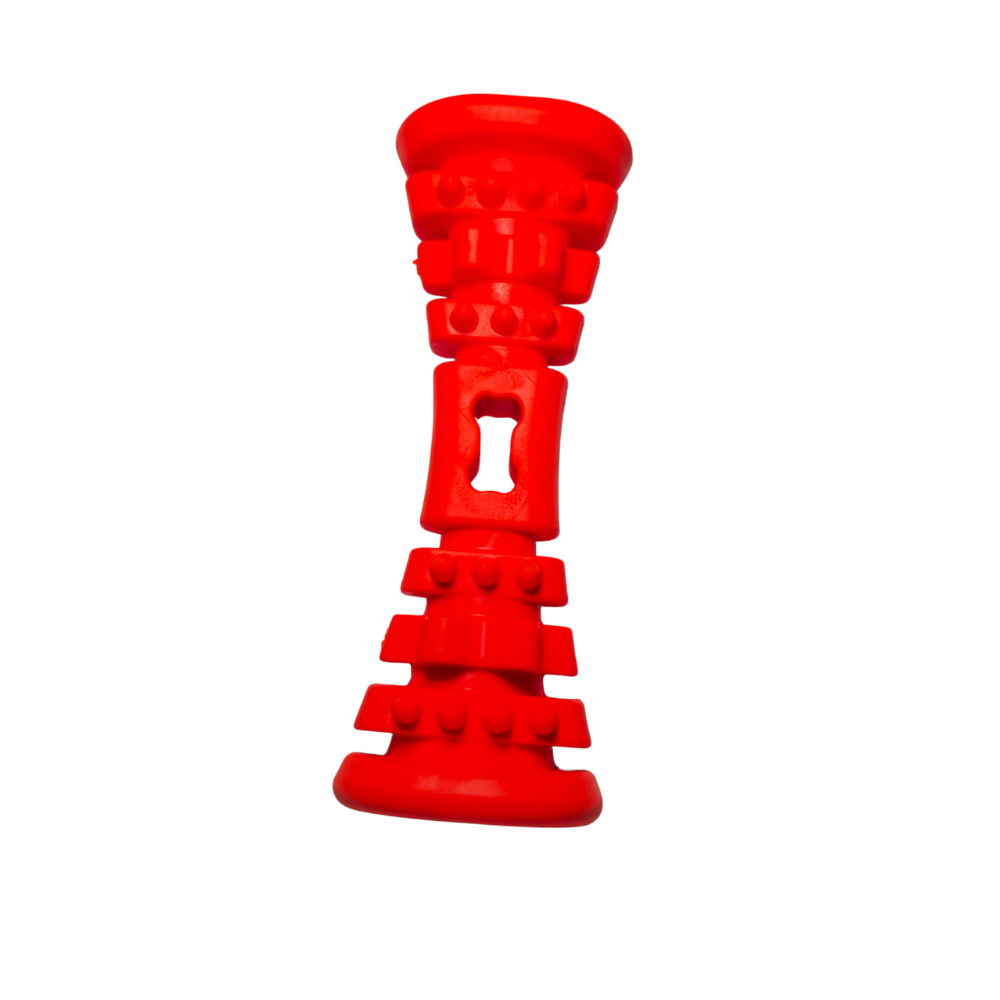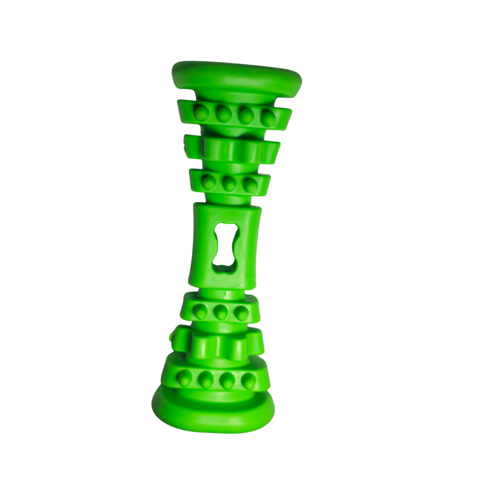 Diseñado para entretener, fortalecer la mandíbula y promover la limpieza dental, combina una textura firme y flexible con protuberancias estratégicas que eliminan placa y masajean las encías cada vez que tu perro lo muerde.