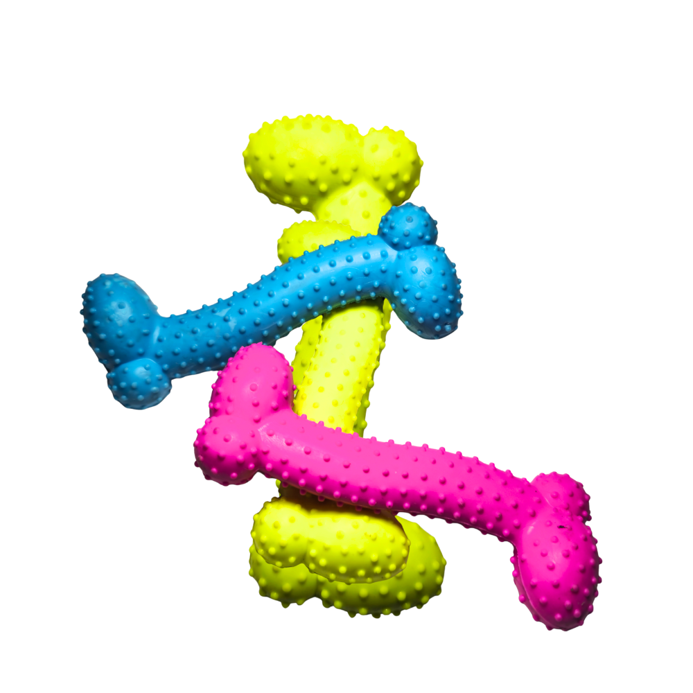 Cada hueso está hecho de goma elastomérica no tóxica, libre de ftalatos, diseñada para soportar mordidas moderadas sin deformarse con facilidad. Las texturas con nódulos y relieves masajean encías, pueden ayudar a reducir placa y estimulan la mandíbula. Ideal para razas chicas y medianas, para etapas de dentición y para perros que necesitan liberar estrés a través de la masticación (siempre con juego supervisado).