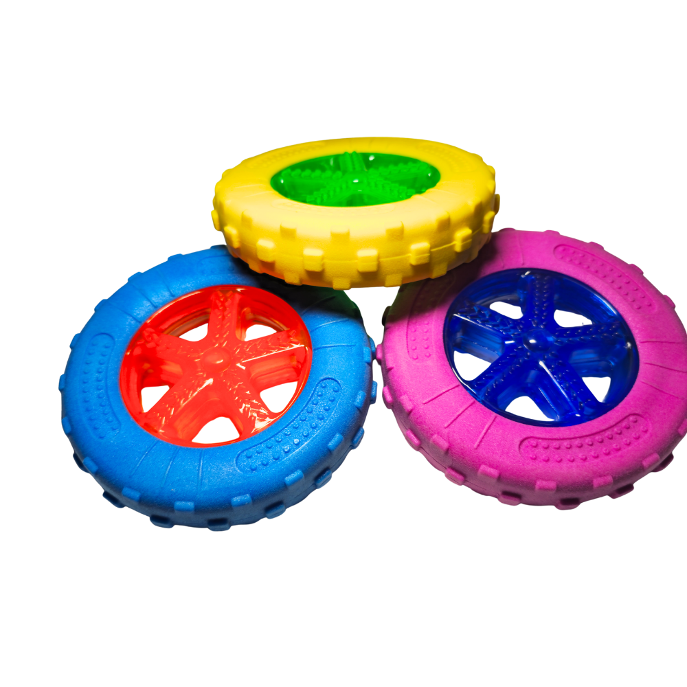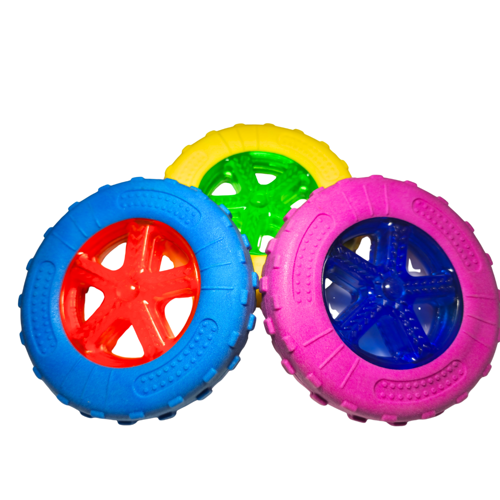 La rueda de goma masticable también flota en el agua, lo que la hace ideal para juegos en la piscina o en la playa. Disponible en colores vibrantes (azul, verde y rojo), es fácil de ver incluso a distancia.